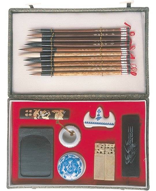 Grundausstattung zum Malen, Kalligraphieren oder Signieren. Inhalt: 1 Reibeschale, 1 Tuschestein schwarz, 10 Pinsel, 1 Porzellanschale, 1 Schöpfkelle, 2 Siegelsteine, 1 Siegelfarbe, 1 Papierbeschwerer und 1 Porzellanpinselableger. Das Etui ist mit Chinabrokat bezogen und innen mit Samt ausgeschlagen. Breite ca. 28 cm, Höhe ca. 4,5 cm, Tiefe ca. 18 cm.